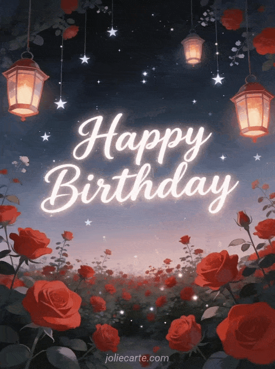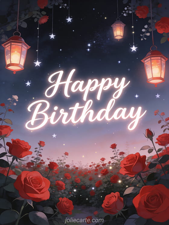 Wish her a happy birthday with this fairy-tale card featuring a blooming garden with red roses and hanging lanterns under twinkling stars. Discover also a birthday card with lavender or a birthday card with tulips.