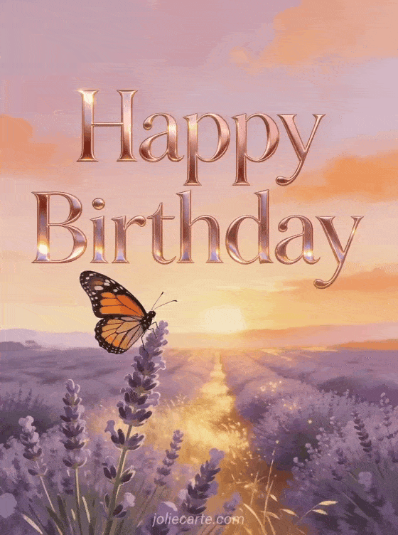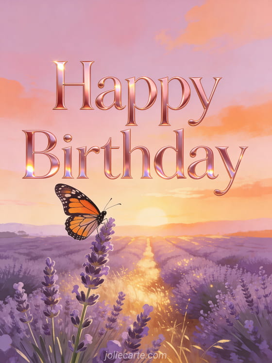 Wish her a happy birthday with this poetic card featuring a lavender field at golden sunset with a monarch butterfly perched on a stem. Discover also a birthday card with tulips or a elegant champagne birthday card.