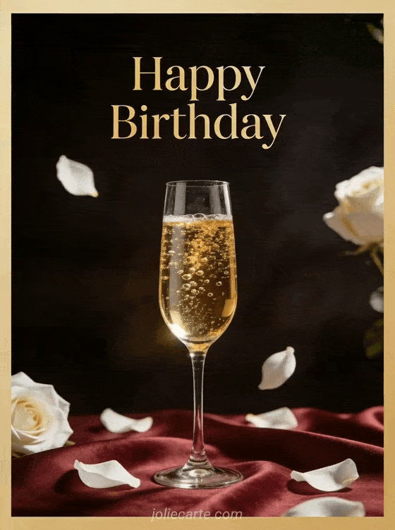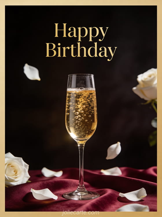 Wish her a happy birthday with this sophisticated card featuring a champagne glass with golden bubbles and white rose petals in a warm, intimate setting. Discover also a birthday card with a butterfly or a birthday card with a cat.