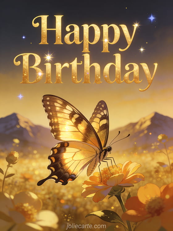 Celebrate a special birthday with this stunning card featuring a majestic swallowtail butterfly perched on a flower in a golden twilight garden, with mountains and twinkling stars. Discover also a funny birthday card or a birthday card with champagne.