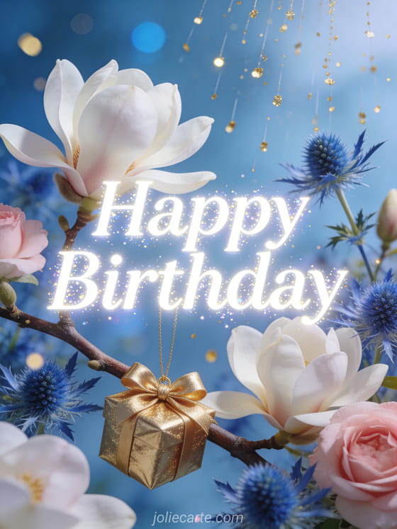 Celebrate a birthday with this elegant card featuring white and pink magnolias with blue thistles, golden sparkles falling from the sky, and a golden gift bow hanging from a magnolia branch. Discover also a birthday card for men or a elegant birthday card for him.