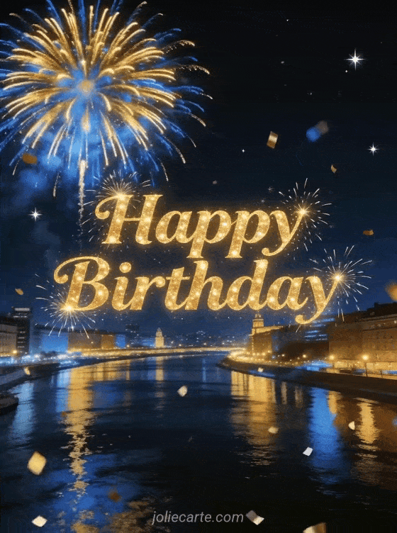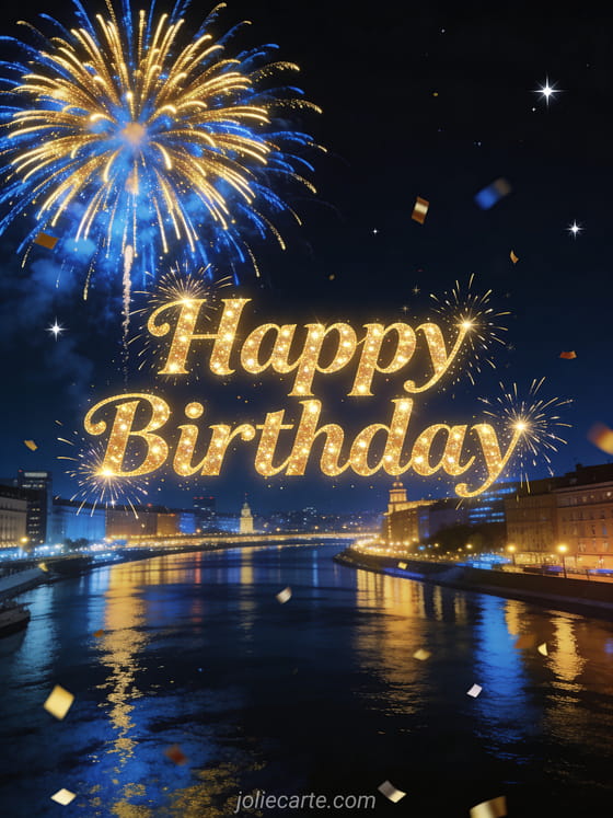 Celebrate a birthday in grand style with this spectacular card featuring golden and blue fireworks exploding in the night sky above an illuminated city with reflections on a river below. Discover also a birthday card for him or a birthday card with flowers.