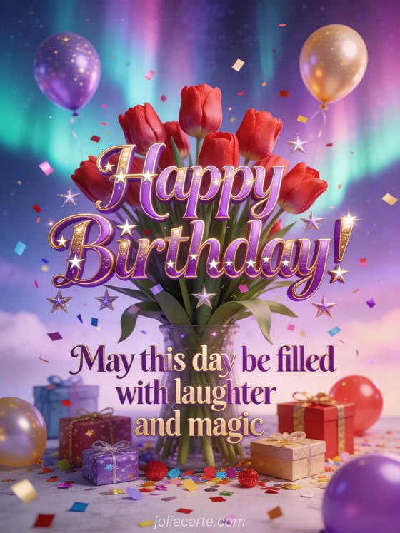 Celebrate a birthday filled with magic with this enchanting fantasy card featuring vibrant red tulips surrounded by colorful confetti, gifts, balloons, and colorful northern lights dancing in the sky. Discover also a birthday card for kids or a birthday card for a girl.