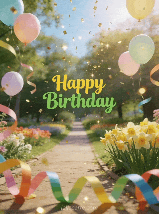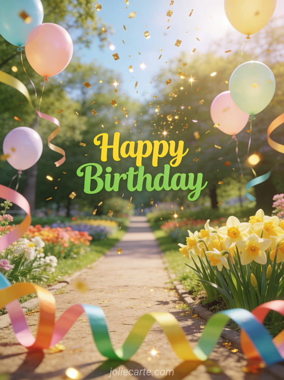 Celebrate a birthday with this cheerful spring card featuring a park with blooming daffodils, pastel balloons floating in the air, and golden sparkles falling from the sky. Discover also a birthday card for kids or a birthday ecard for kids.