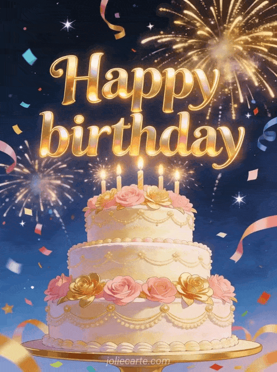 Send this grand birthday card featuring an elegant three-tier birthday cake decorated with pink and golden sugar flowers with sparkling candles and golden fireworks bursting in a deep blue night sky. Discover also a birthday card with wildflower superbloom or a romantic birthday card for friend.