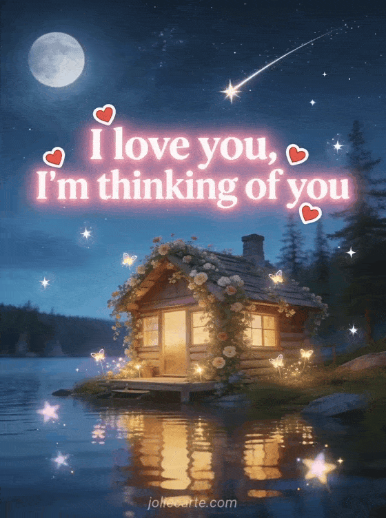Express your love with this beautiful card featuring a charming cabin by a lake surrounded by hearts. A tender message to tell someone special you're thinking of them. Discover also a I love you thinking of you card or a thinking of you with kisses card.