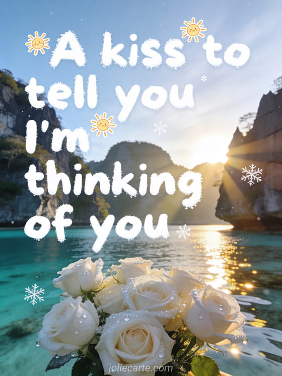 Send a sweet kiss with this beautiful card to tell someone special you're thinking of them. A warm winter illustration with soft sunshine to brighten their day. Discover also a I love you thinking of you card or a romantic thinking of you card.