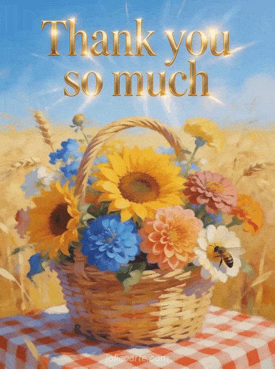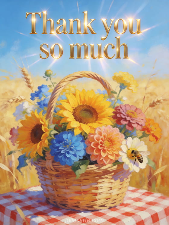 Express your deep gratitude with this cheerful card featuring sunflowers and dahlias in a bright summer setting. A warm and joyful illustration to say thank you so much. Discover also a thank you for your reply card or a thank you and have a nice day card.