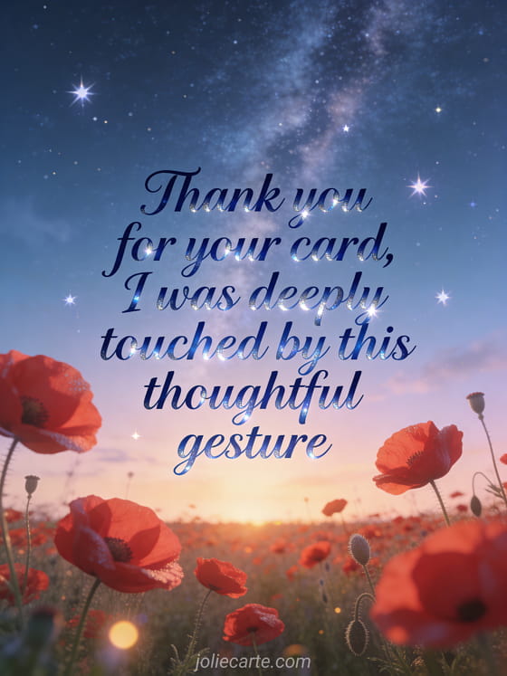 Thank someone for their beautiful card with this poetic illustration featuring a meadow of poppies. Express how deeply touched you were by their thoughtful gesture. Discover also a thank you for your lovely card or a your card made me very happy.