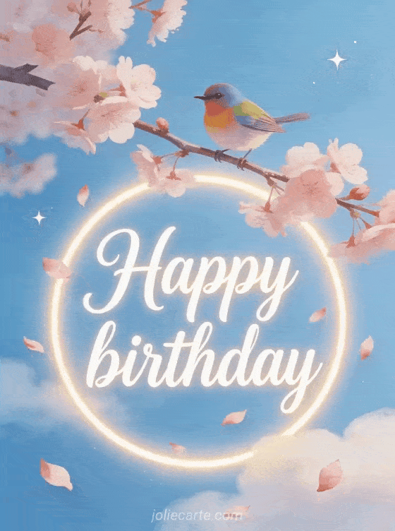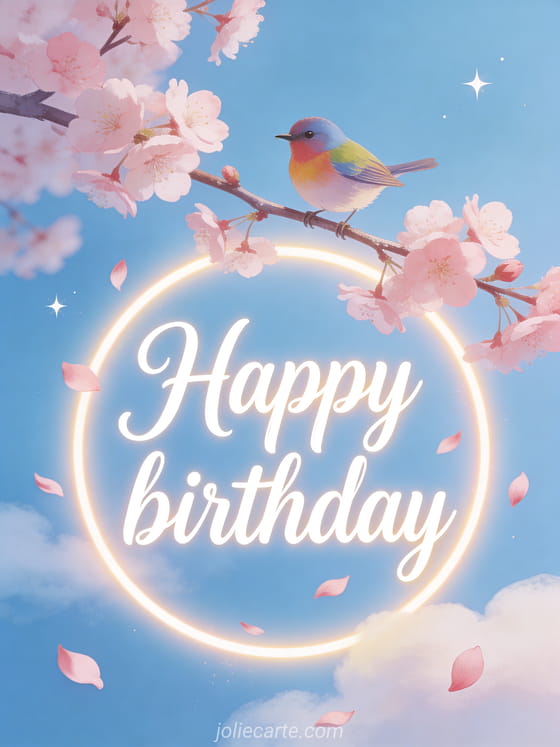Send this poetic birthday card for Mom featuring a colorful bird perched on a cherry blossom branch with falling pink petals under a soft blue sky. Discover also a happy birthday card for Mom or a birthday message for Mom.