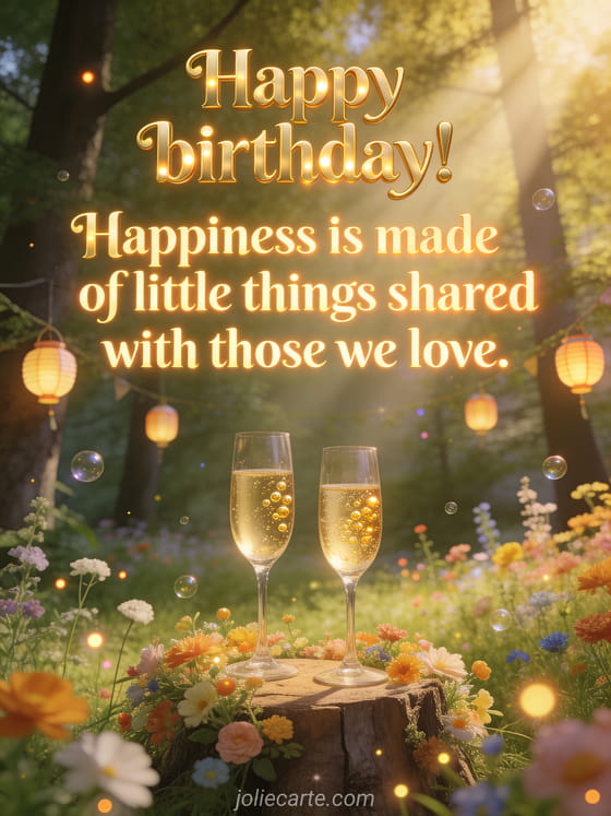 Happy birthday! Happiness is made of little things we share. a warm birthday card with champagne in a forest clearing