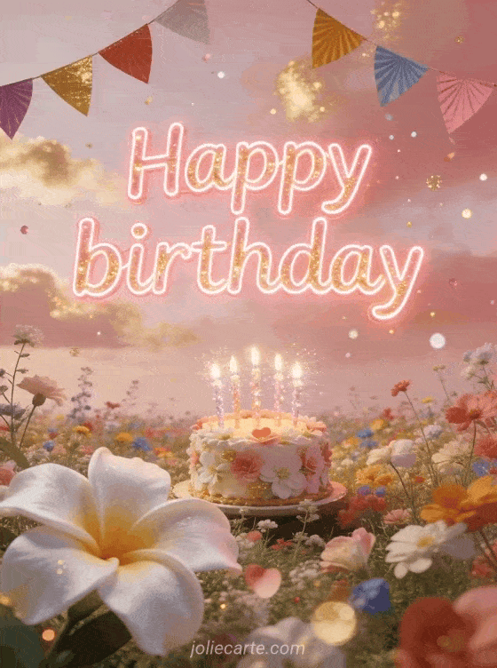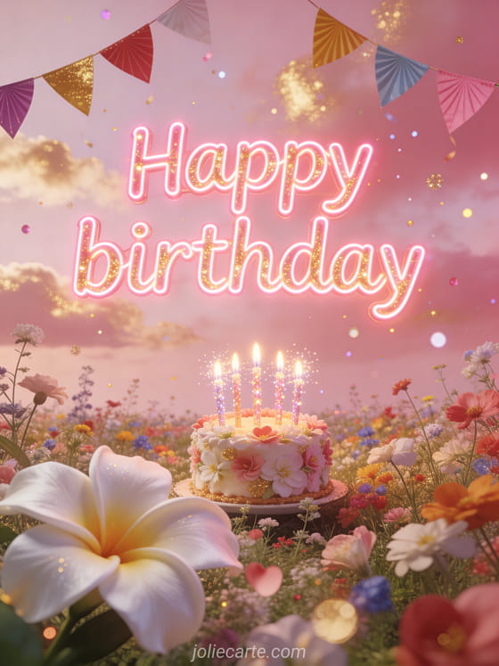 Send this enchanting birthday card with a romantic wildflower field, glowing pink neon letters, colorful bunting, and a small flowered birthday cake under a rosy sky. Discover also a unicorn birthday card for daughter or a happy birthday card for daughter.