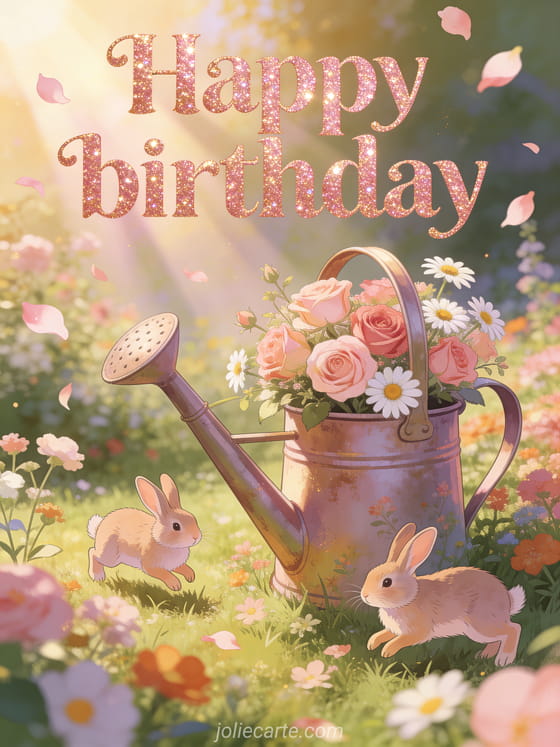 Send a beautiful animated birthday card featuring a pretty blooming garden scene with roses and daisies overflowing from a vintage watering can, two playful rabbits in a meadow and warm sunrays through petals. A fresh and joyful springtime greeting. Discover also a free animated birthday e-card or a animated birthday card.