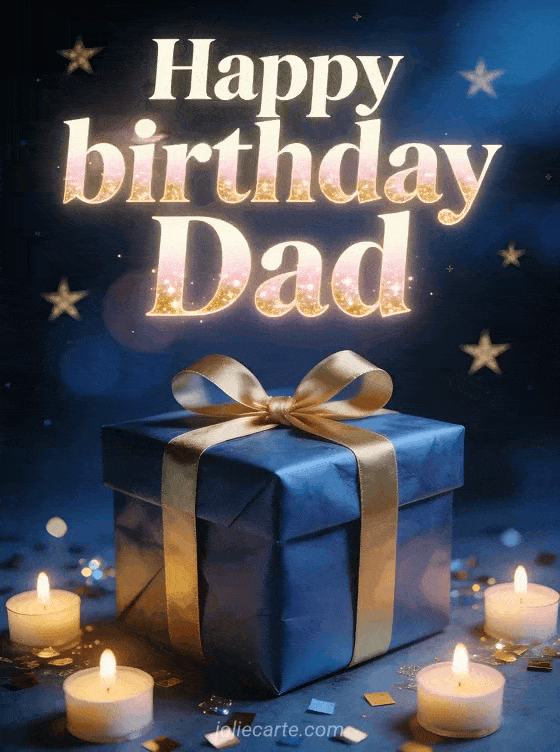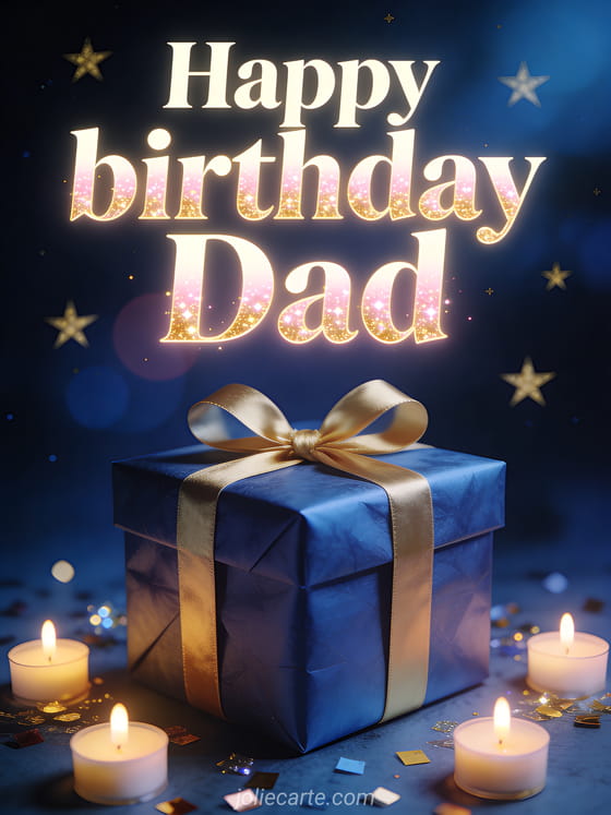 Celebrate your dad's birthday with this elegant free card featuring a beautiful midnight blue gift box with golden ribbon, lit candles, brilliant confetti and golden stars. A festive and refined atmosphere. Discover also a happy birthday card for dad or a birthday card for dad.