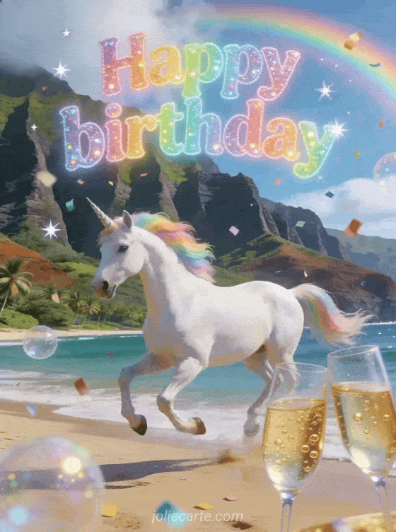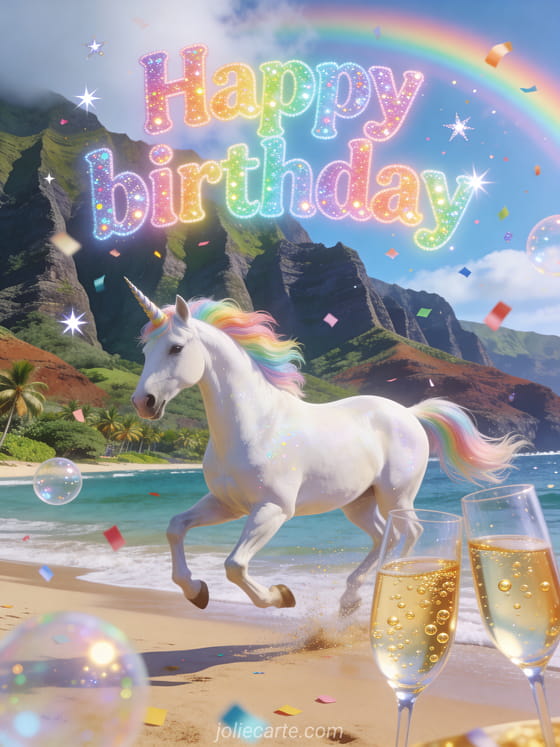 Surprise your daughter with this enchanting free birthday card featuring a majestic unicorn with a rainbow mane galloping on the beach, champagne and confetti. A fairy-tale celebration under the rainbow. Discover also a birthday card for my daughter or a free birthday card for a girl.