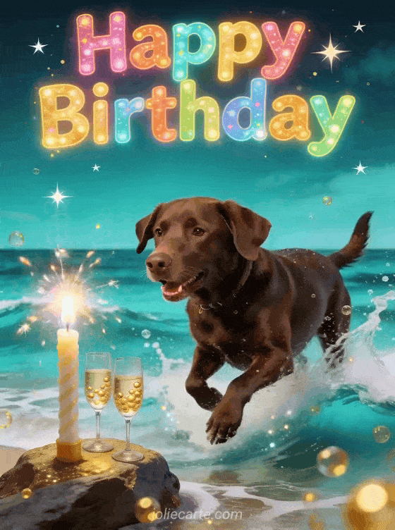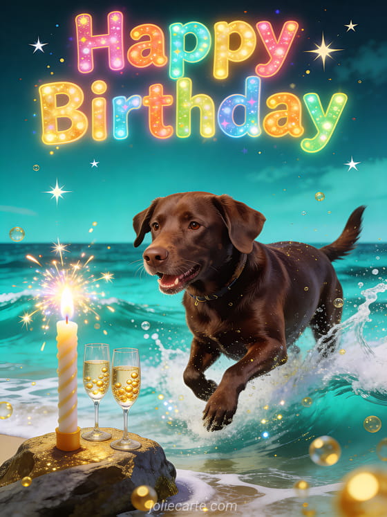 Celebrate with this dynamic birthday card featuring a joyful chocolate labrador playing in turquoise waves with a sparkling sparkler, champagne glasses with golden bubbles on a rock and bright stars in the sky. Discover also a teen birthday image or a teen birthday gif.