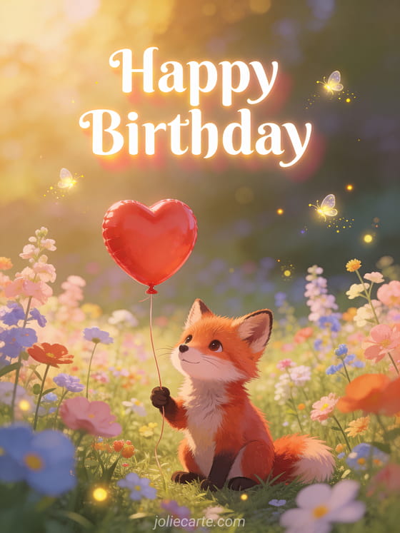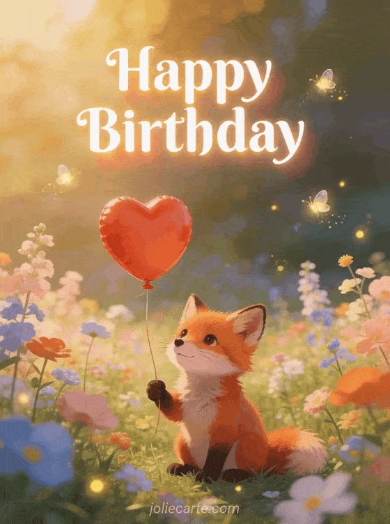 Celebrate a birthday with this poetic card featuring an adorable little red fox sitting in a colorful spring flower field, holding a red heart balloon with golden light and glowing fireflies. Discover also a happy birthday mom gif or a birthday card from child to mom.
