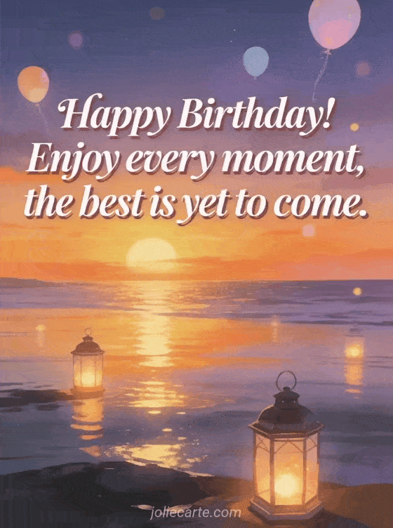 Celebrate a birthday with this poetic card featuring a magnificent sunset over the sea with floating lanterns, golden reflections on calm water and pastel balloons rising into the sky. Discover also a teen birthday gif or an birthday card for teens.