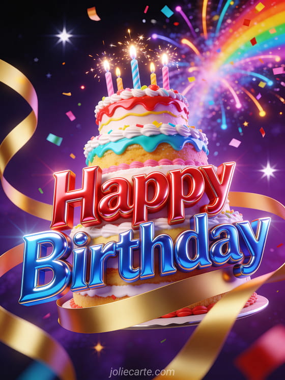 Celebrate with this spectacular birthday card featuring a multi-tiered cake with sparkling candles, an explosion of rainbow confetti and golden ribbons swirling on a starry purple background. Discover also a birthday card with text for teens or a teen birthday gif.