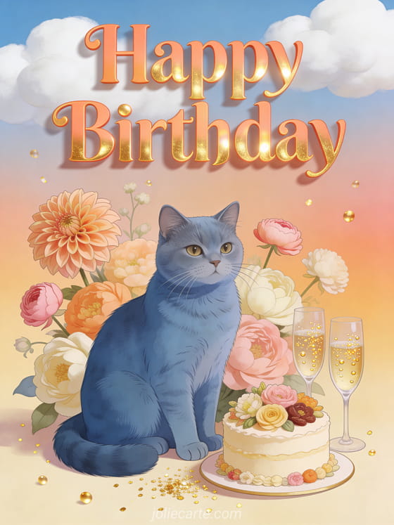 Celebrate your daughter's birthday with this elegant card featuring coral dahlias, ranunculus, a Russian blue cat and a cake decorated with edible flowers. Discover also a pretty birthday card for girl or a birthday card for my daughter.