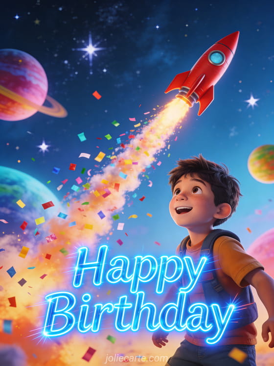 Celebrate a birthday with this dynamic animated card featuring a red rocket blasting off into a starry sky with a trail of multicolored confetti, colorful planets in the background and twinkling stars. Discover also a animated happy birthday virtual card or a animated birthday card with dog.