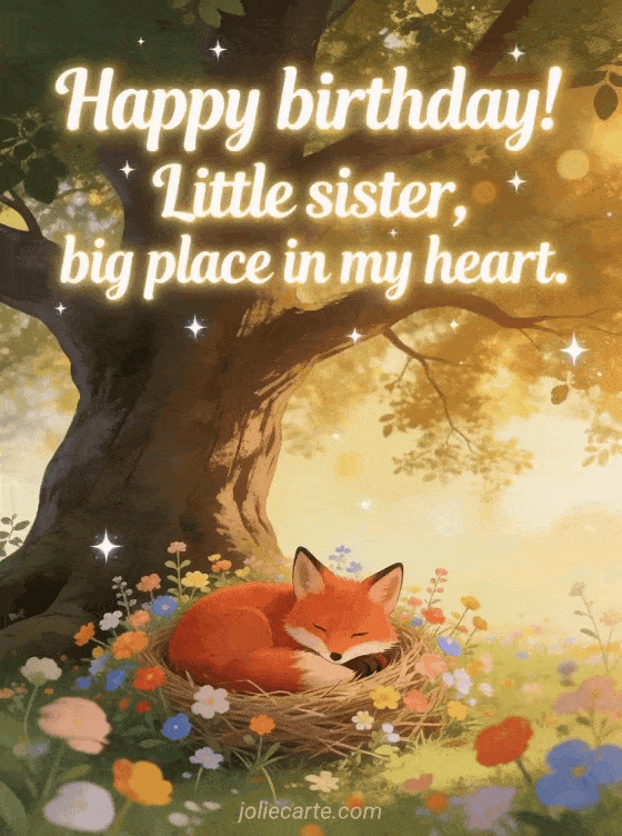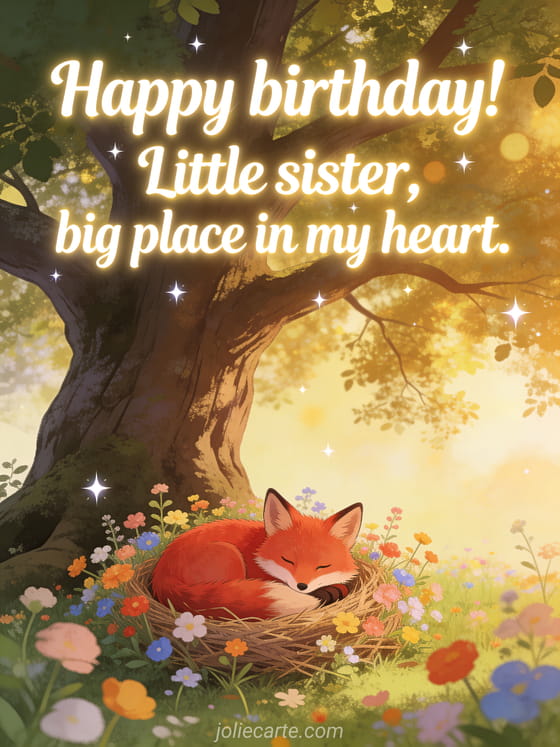Celebrate your little sister's birthday with this tender greeting card featuring an adorable red fox nestled in a bed of colorful spring wildflowers at the foot of a grand oak, golden filtered light and twinkling stars. Discover also a happy birthday big sister gif card or a birthday text for a sister.
