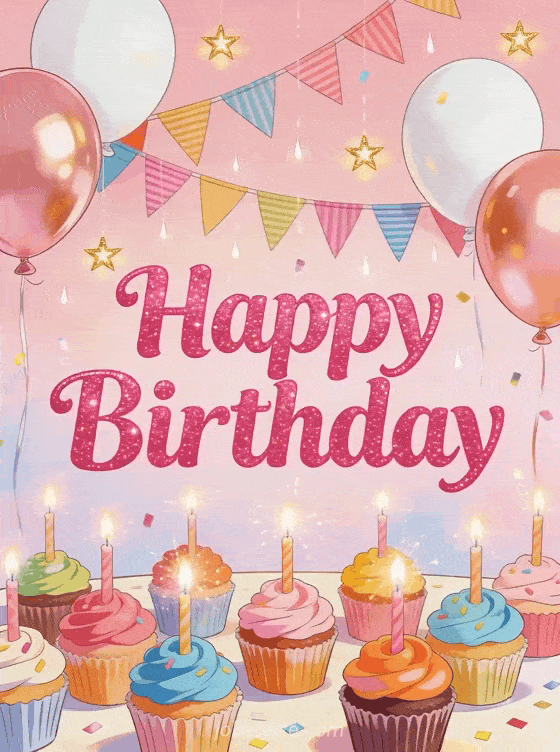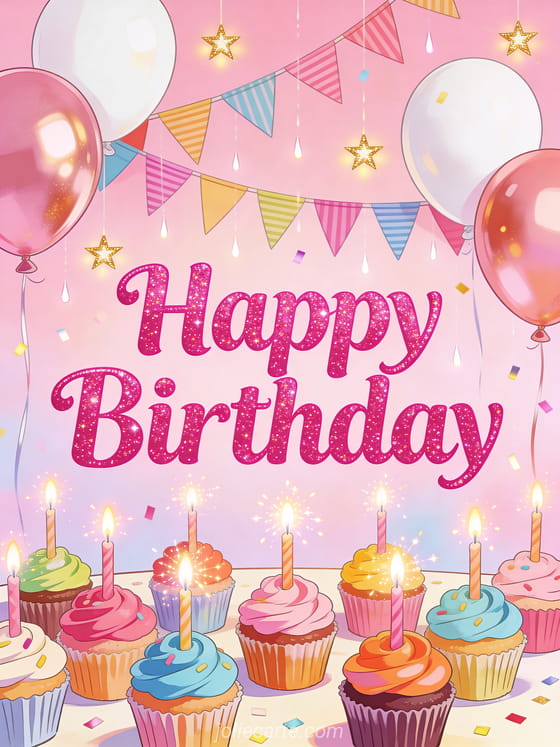 Celebrate a birthday with this vibrant greeting card featuring a festive table covered in colorful cupcakes with bright frosting, sparkling candles, multicolor bunting garlands, rose gold balloons and golden stars on a pastel pink background. Discover also a happy birthday young girl card or a birthday card for a young girl.