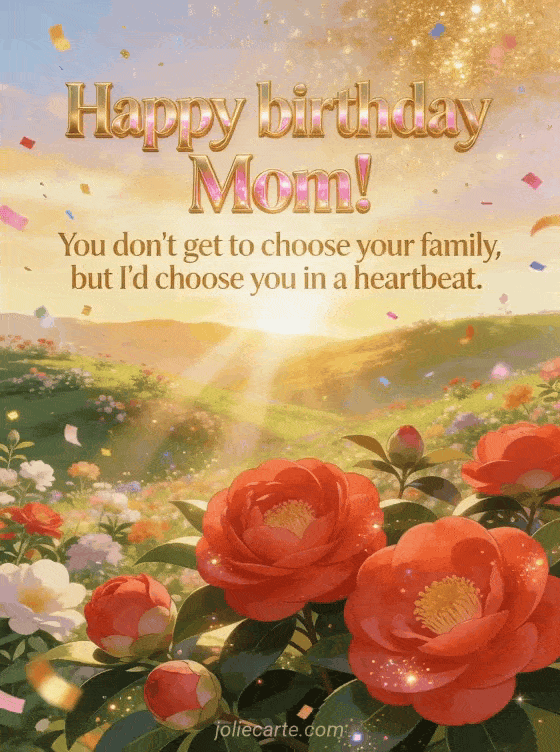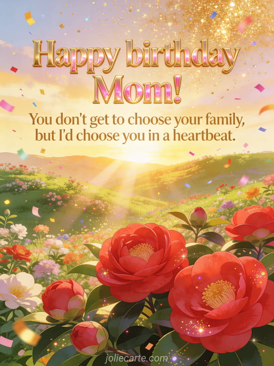 Celebrate your mom's birthday with this radiant greeting card featuring a blooming valley at golden sunrise with vibrant red camellias, golden glitter rain and colorful confetti swirling in the morning light. Discover also a happy birthday Mom message card or a happy birthday to the best mom card.