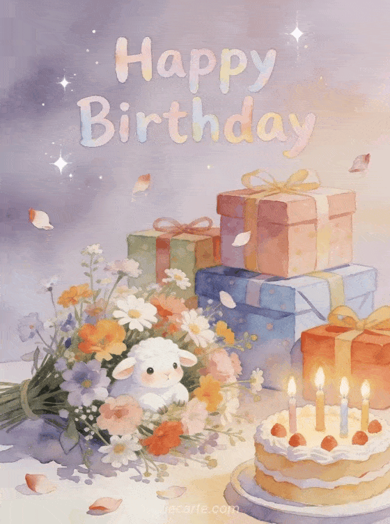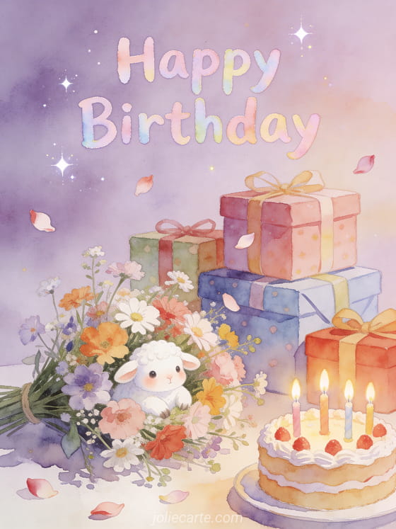 Brighten someone's birthday with this adorable watercolor card featuring a cute white lamb surrounded by colorful gifts and a birthday cake with lit candles. Discover also a free animated birthday card or a animated birthday card for boys.