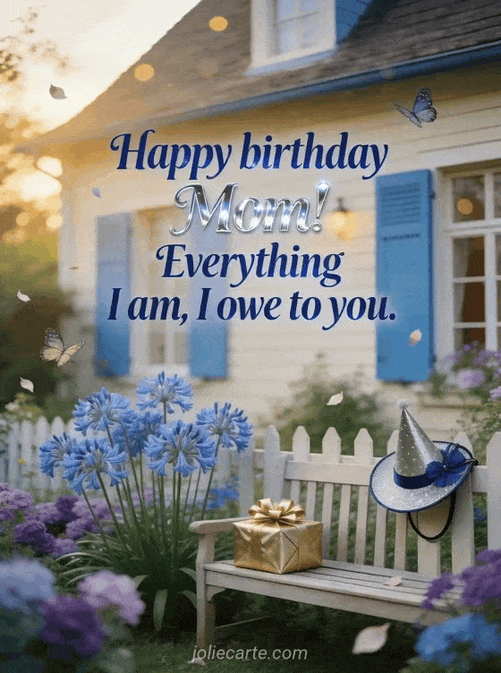 Celebrate your mom's birthday with this warm greeting card featuring a charming country house with blue shutters, a blooming garden of blue and purple agapanthus, butterflies and petals floating in the afternoon light. Discover also a happy birthday to the best mom card or a happy birthday mom card.