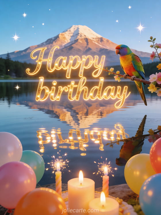 Celebrate a special day with this beautiful animated birthday card featuring a mirror lake with perfectly reflected mountains, a colorful budgie on a flowering branch and sparkling birthday candles with colorful balloons. Discover also a animated birthday card or a musical animated birthday card.