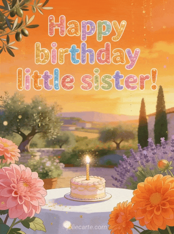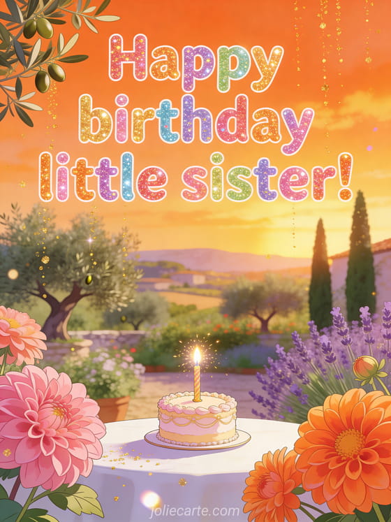 Celebrate your little sister's birthday with this gorgeous greeting card featuring a Mediterranean garden bathed in golden sunset light, blooming dahlias and a sparkling birthday cake. Discover also a happy birthday little sister card or a birthday drawing for sister.