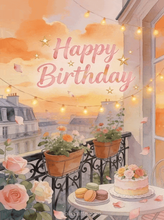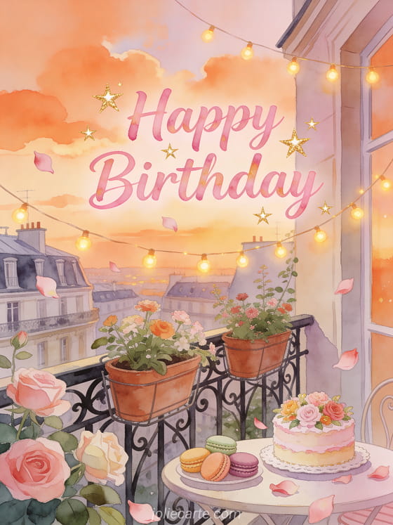 Celebrate a special birthday with this enchanting greeting card featuring a Parisian balcony at twilight, colorful macarons and a flower-decorated cake. Discover also a teen birthday card or an happy birthday image for teens.