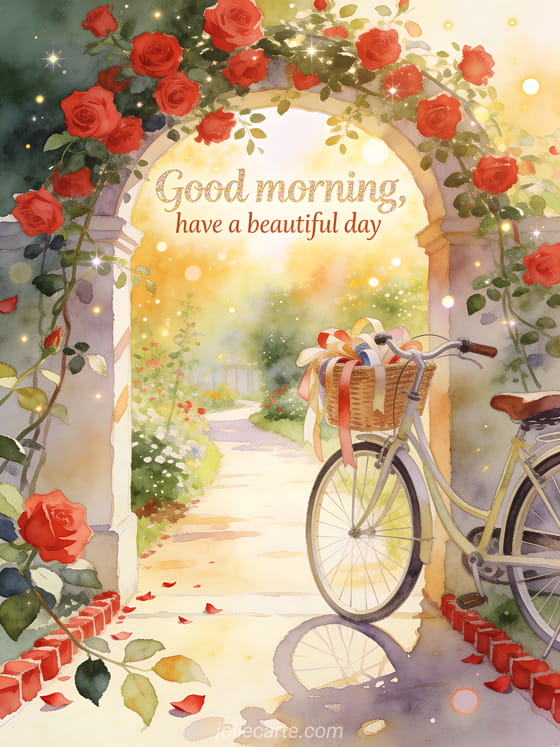 Send a good morning message with a sunny card that opens onto a rose garden, perfect for wishing someone a beautiful day. You can also share hello how are you, a virtual good morning card or good morning how are you.