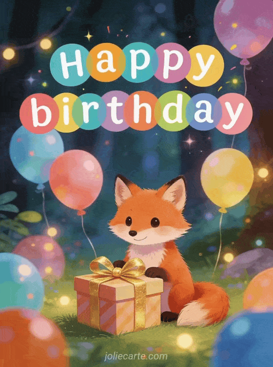 Share a joyful happy birthday message with this magical fox-themed design, colorful balloons, and an enchanted forest atmosphere. You can also discover happy birthday gif red, very happy birthday, and happy birthday champagne.