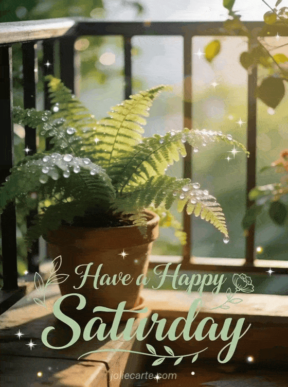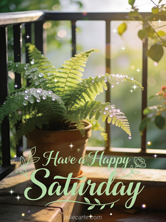 A happy saturday a fresh and natural Saturday greeting with a dewy fern on a morning terrace