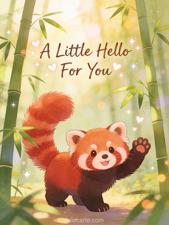 Brighten someone's day with this adorable little hello card. A cute red panda waves its fluffy tail in a soft bamboo forest. Also discover a hello with coffee card or a thinking of you card.