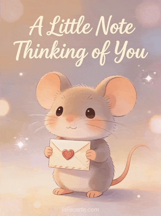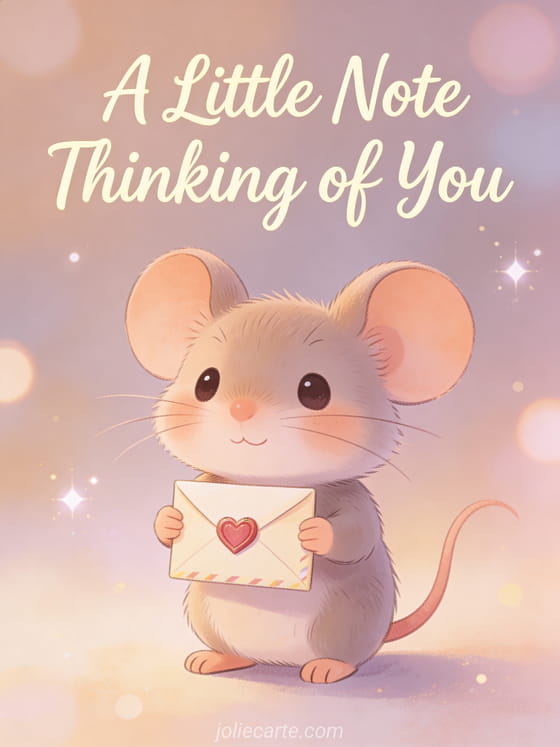 Let someone special know they are in your thoughts with this adorable card. A cute little mouse holds a tiny envelope with a heart seal. Discover also a thinking of you message or a thinking of you image.