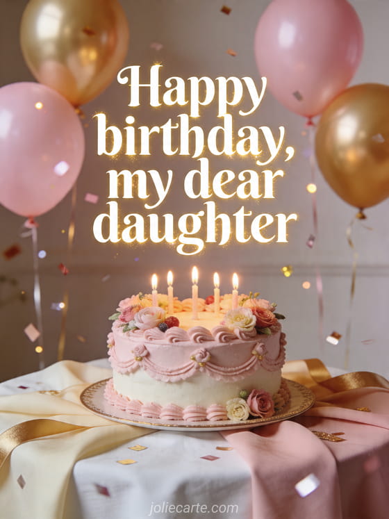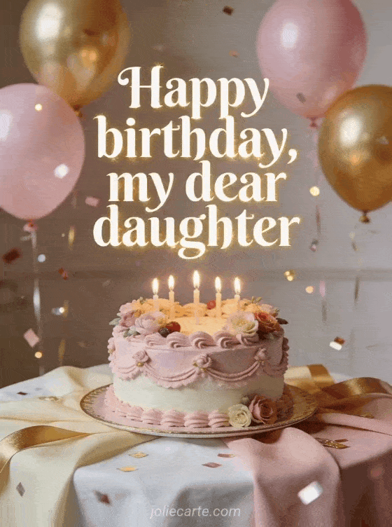 Celebrate your daughter with this sweet birthday card featuring an elegant cake with candles, pink and gold balloons, and sparkling confetti. You can also discover poem for my daughter birthday, little birthday poem for my daughter, or poem for birthday for my daughter.