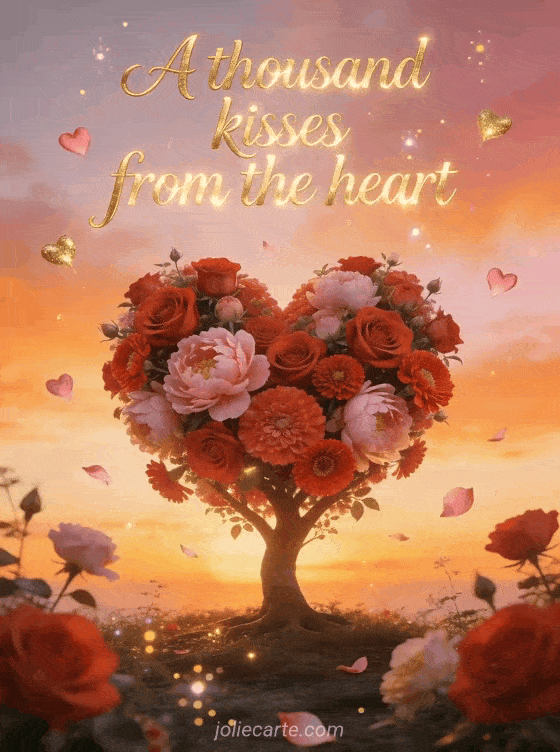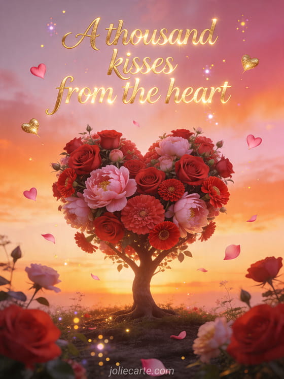Share a poetic message with this free heart kisses card featuring a flower tree shaped like a heart at sunset. Discover also romantic kisses good night gif, couple kisses in the water or love kisses image.
