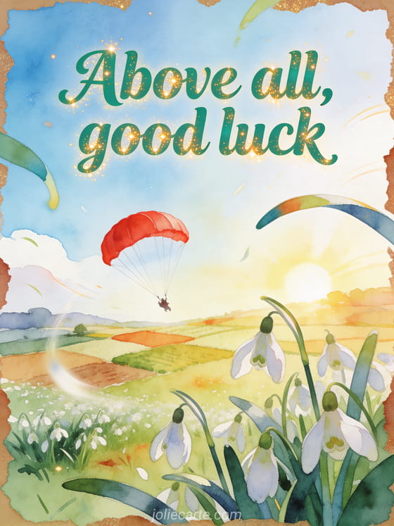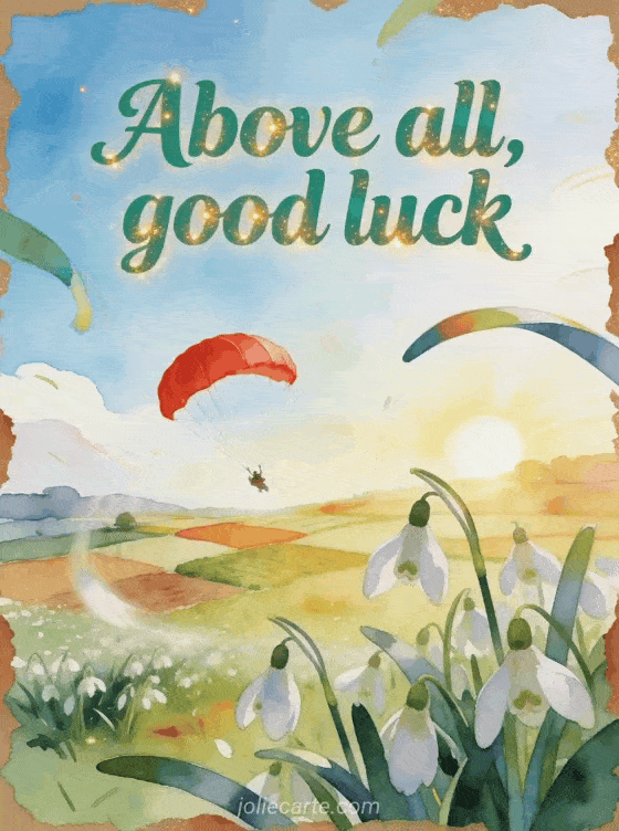 Send and above all good luck gif with emerald lettering, a bright red parachute above a sunny patchwork landscape, snowdrops and curved leaves. Discover also good luck images, and then above all good luck gif or a good luck animated picture.