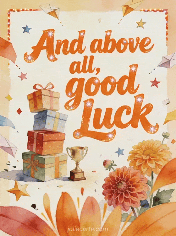 Send and then above all good luck gif with orange lettering, wobbling gift boxes, a tiny lucky trophy, dahlias and flying paper stars. Discover also a good luck animated picture, a good luck everyone image or a message to wish someone good luck.