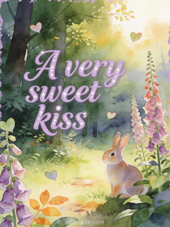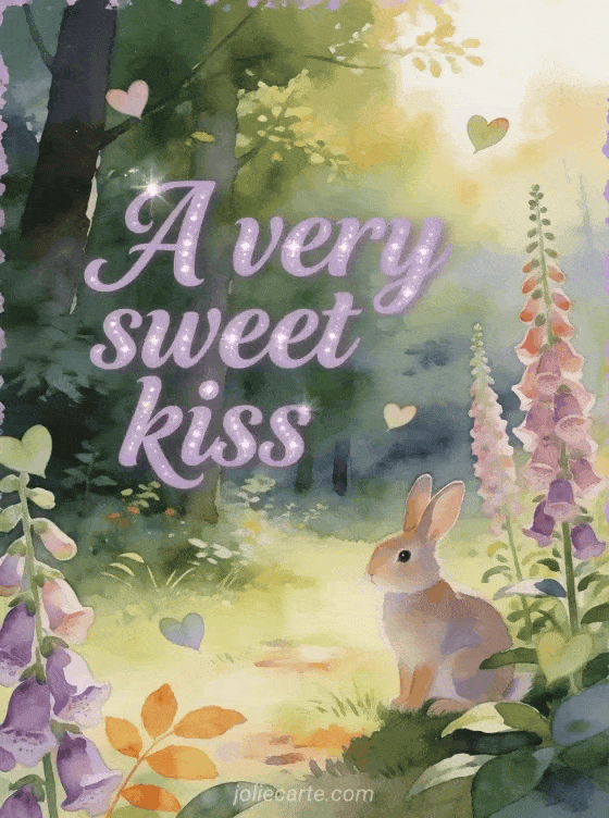 Send a very sweet kiss with gentle lavender script, pearly sparkle, a rabbit in a woodland clearing, tall foxglove flowers and floating heart leaves. You can also share a kitten kisses gif, a kisses gift or a lots of kisses cat gif.