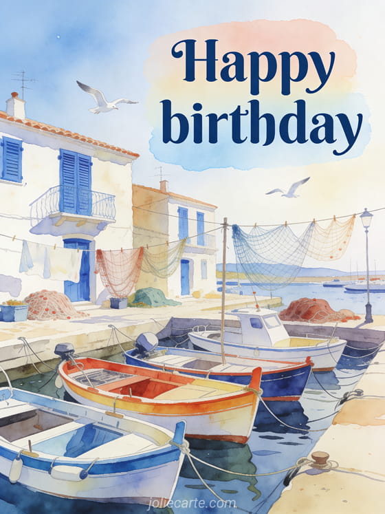 Surprise him with this stunning animated birthday card featuring a picturesque watercolor fishing port. Discover also a happy birthday gif for him or a free birthday card for him.