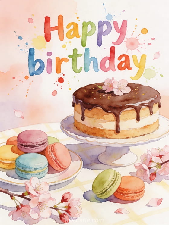 Share this photorealistic birthday card with a chocolate cake, colorful macarons, and cherry blossoms for a fresh spring celebration. You can also browse animated happy birthday, free animated birthday cards adults, and free animated birthday cards dromadaire.