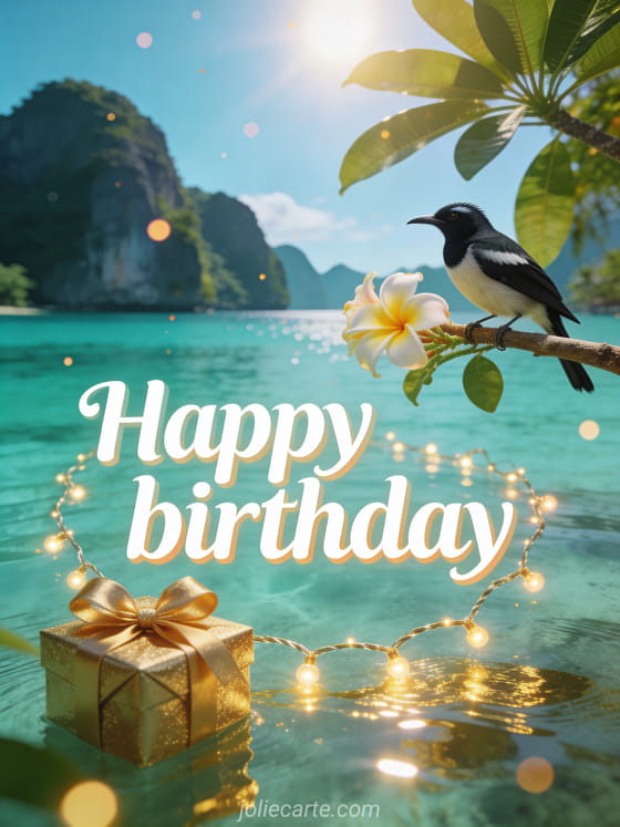 Brighten someone's special day with this beautiful animated birthday card featuring a turquoise tropical lagoon, a great tit perched on frangipani blossoms, and golden light reflections. Also discover a musical animated birthday card or a beautiful animated birthday card.