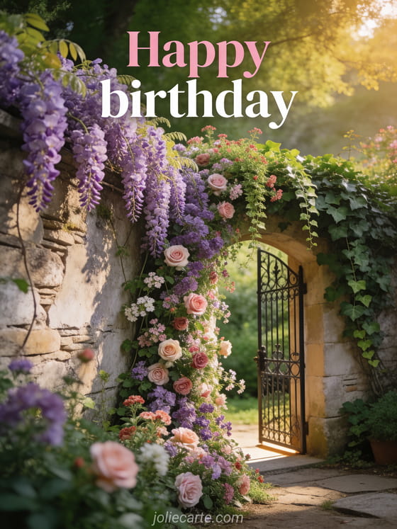 Share a beautiful animated birthday card with a waterfall of flowers cascading over an ancient stone wall with wisteria and hollyhocks. Discover also an animated musical birthday card or an animated happy birthday card.