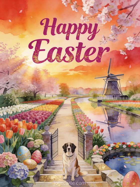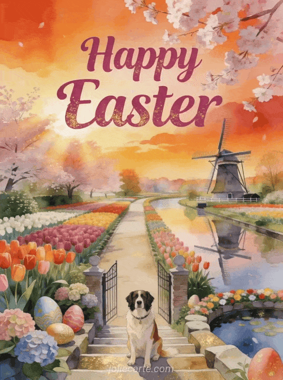 Celebrate Easter with this charming animated greeting card featuring an Australian Shepherd at the entrance of a Keukenhof garden path with tulips in sunset shades, a Dutch windmill reflected in a canal, and Easter eggs among hydrangeas. Also discover cartes virtuelles joyeuses paques gifs joyeuses paques.