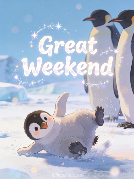 Wish someone a great weekend with this funny animated card featuring a clumsy baby penguin. Check out also a have a great weekend card or a happy weekend card.