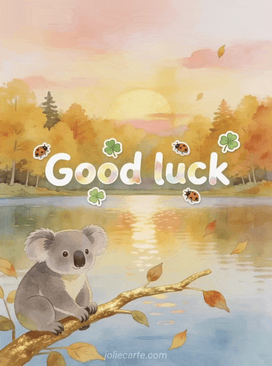 Share this delightful animated good luck card featuring a koala on a golden autumn branch by a lake at sunset. Discover also a good luck message competition card or a how to wish someone good luck card.